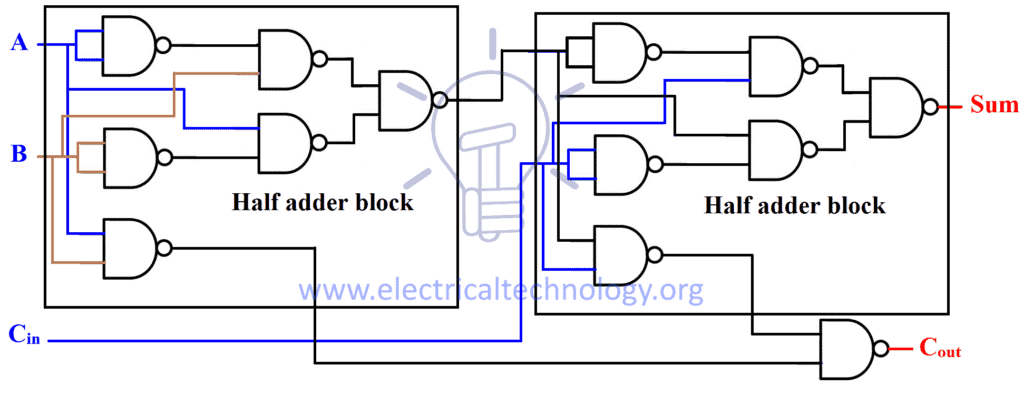 A full adder can be implemented using two half adders in cascaded setup.