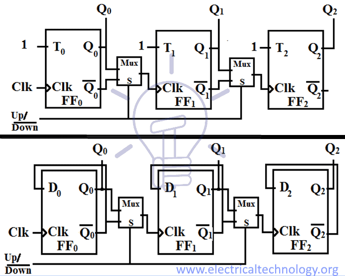 The difference between the up-counter and down-counter is the clock signal. So we will use 2_1 Mux to select the 2 clock signals.