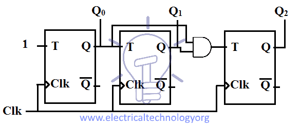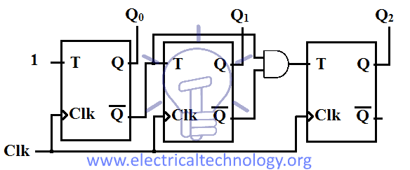 Q2 toggles when both Q0 & Q1 are 0. So the input to FF2 will be the AND of complemented outputs of FF0 & FF1 i.e. T2 = Q̅0 & Q̅1.