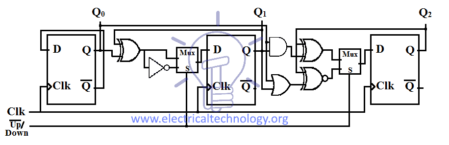 This counter has two modes of counting i.e. up counting and down counting. There is a mode switch which switches between the two modes of the counter. When the mode M = 0 it counts up & when mode M = 1 then it counts down.