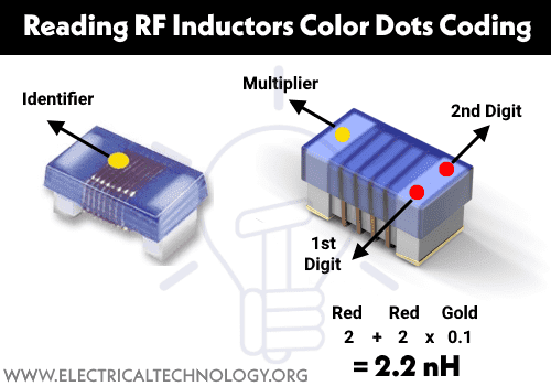 On the other hand, if there are three colored dots printed on the RF inductors, the first two opposite colored dots (in clockwise direction) show the first and second digit (significant figures) respectively while the single dot on the other end represents the multiplier.