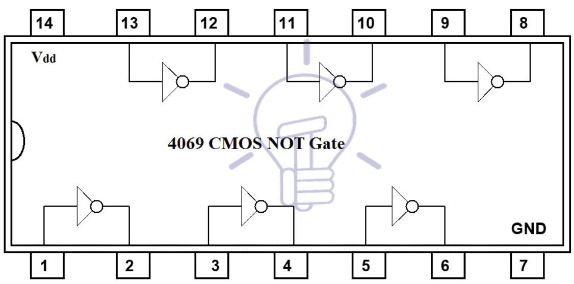 4069 is CMOS NOT gate IC with same pin description as TTL.