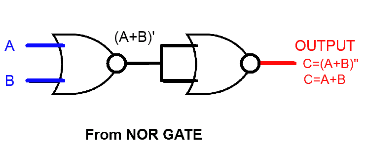 OR gate constructed from NOR GATE is given above. NOR is actually INVERT of OR. So placing an INVERT/NOT gate to the output of NOR gate will provide OR gate’s result. Or placing a NOR gate with common input line in front of NOR gate will also do the job as it will act as an INVERTER.