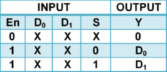 Consider D0, D1 as input /data channel,and “S” as control signal and “Y” as output. The truth table for 2 to 1 MUX is given below.
