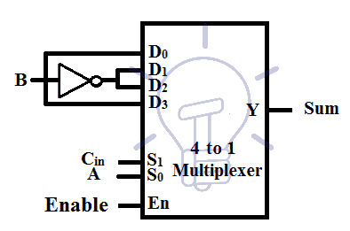 We will use Cin, A as control signal S1, S0 respectively. Channel D0, D3will be connected with B and D1, D2 will be connected with B̅.