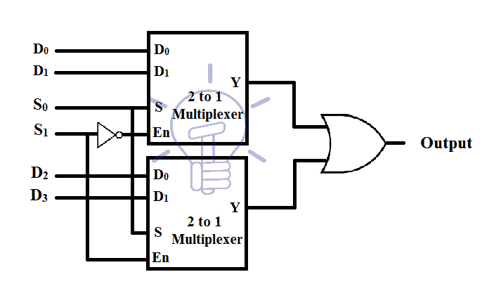The second configuration uses 2 Muxes but it uses the enable pins of Individual Muxes as the 2nd control signal S1. Its diagram is given below.