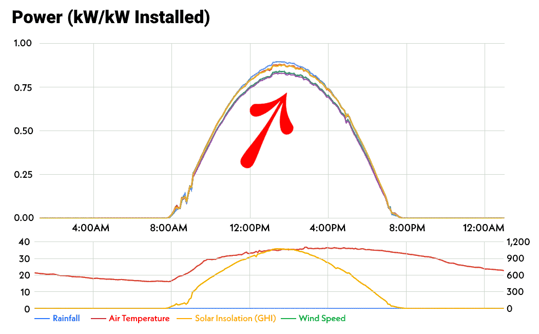 Due to reasons two, three, and four, in areas where sunshine for roughly 10 hours a day, even in summer, solar panels produce on average only 80% of the written power. If clouds are dense, production can drop below 80%. The given calculations assume minimal clouds, allowing visibility of the sun. You can also see this fact in the graph below, indicated by the red arrow on the curve.