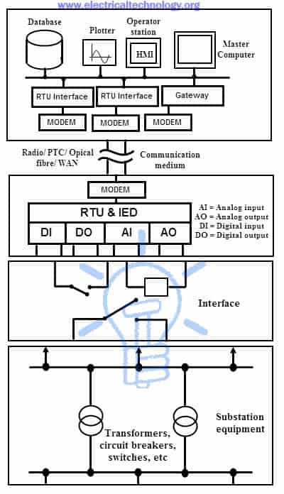 SCADA system continuously monitors the status of various equipments in substation and accordingly sends control signals to the remote control equipments. Also, it collects the historical data of the substation and generates the alarms in the event of electrical accidents or faults.