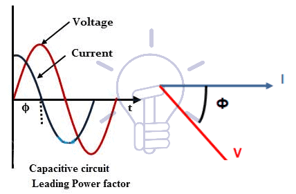 If capacitance prevails (XC = 1/2πfC = 1/ωC ), which is the case of networks with long underground cables.Current will be leading (Figure 3) and reactive power is called capacitive power.