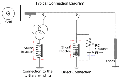 Those three windings are star connected with the neutral point accessible (YN). The neutral point is connected to the earthing system of the installation through the tertiary winding of a power transformer or directly. Figure 5 shows a typical connection diagram of a shunt reactor.