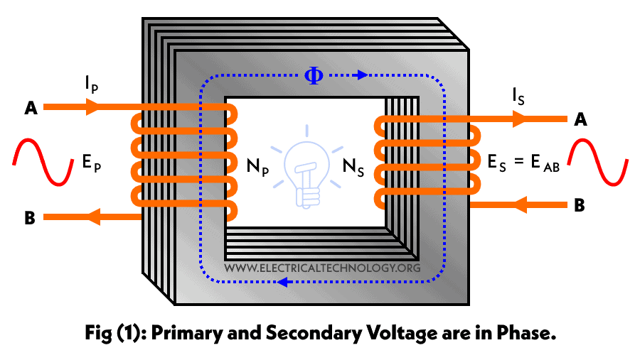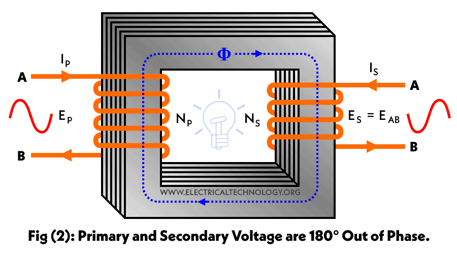 Consequently, the voltage induced in the Secondary winding in fig (2) is 180° out of phase as compared with the induced voltage in secondary in fig (1) and the direction of secondary current (IS) is opposite from the primary current (IP) as well.