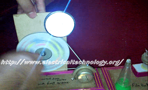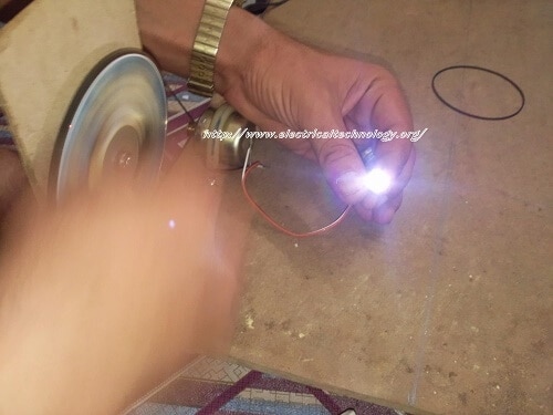 • Fix a small plastic pulley on the threaded end of the motor. connect the small and big pulley with a large rubber band. When rotate & turn the handle, the armature will rotate in the magnetic field (in the case above, Motor will work as a generator). This spinning armature will generate a current in the coil which will light up the LED.