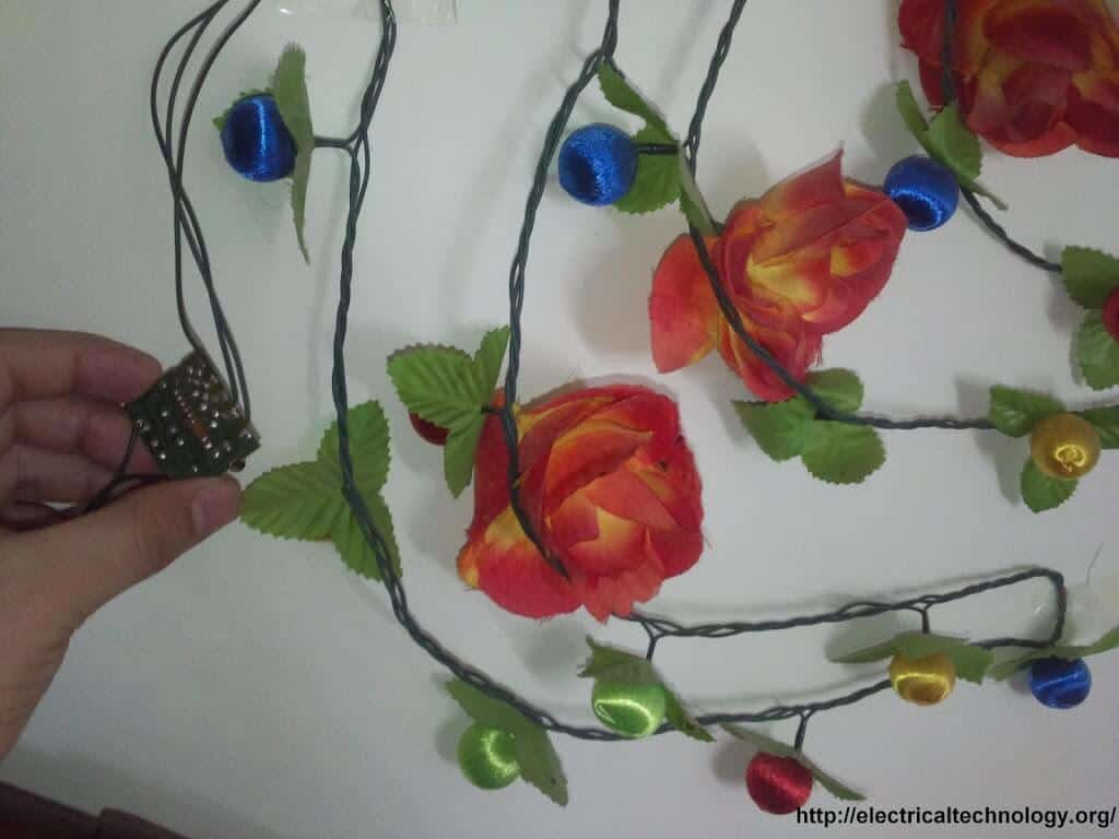 when you complete the circuit on general purpose PCB or breadboard, then connect 60 Nos of LED (white or whatever color you want). Now supply the 230V AC (UK) or 120V AC (US) and the LED string will start to glow and flash. You may also control the way of blinking by pressing the control button on the circuit box.
